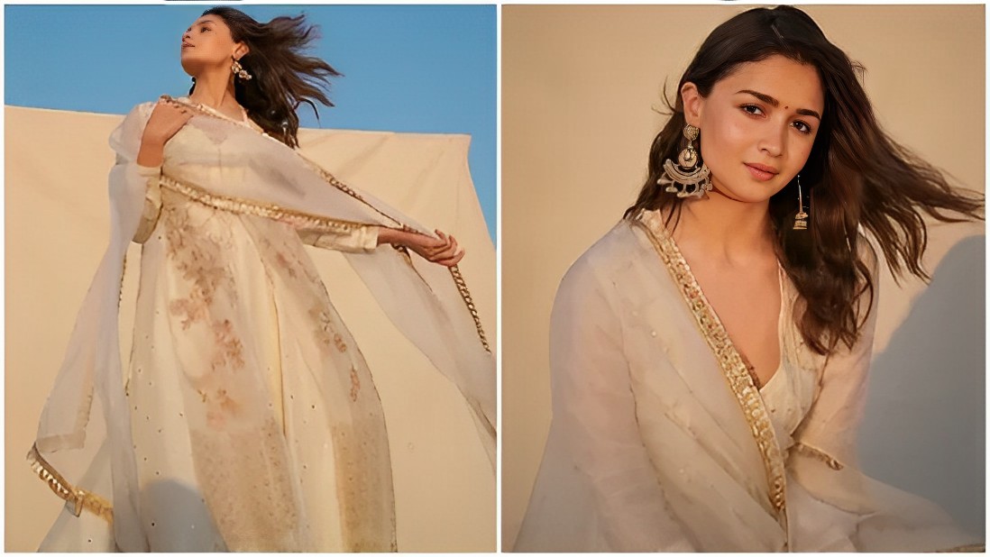 Look Alia Bhatt She looks stunning in this white cotton suit with a flowery pattern. This style is ideal if you're looking for something straightforward to wear on Vavratri.